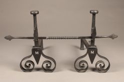 19th century English cast iron andirons with bar and initial “M”.