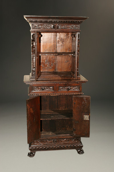 17th century Italian Renaissance cabinet made in walnut with wonderfully detailed carving, circa 1650-70.