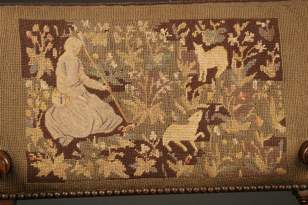 17th century style French armchair featuring rope twist frame with carved figures on arms in the style favored by French Royalty. Original needlepoint upholstery also in 17th Century motif. century1870.