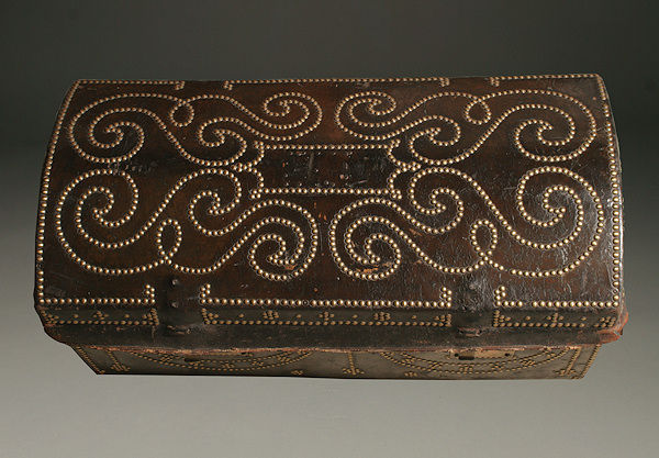 18th century French leather covered brass studded coffer. Circa 1790.