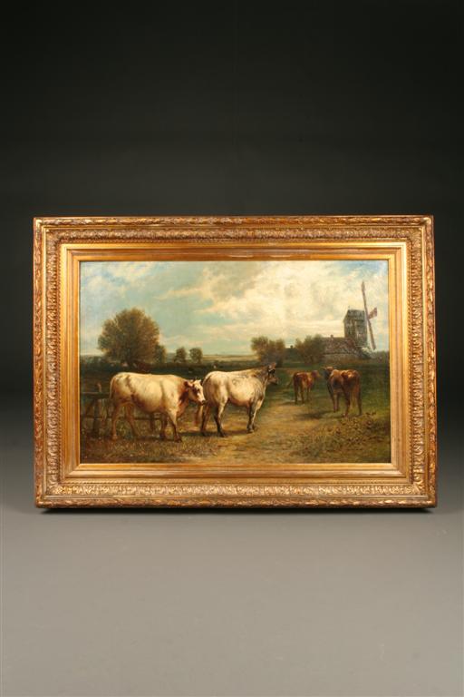 Oil on canvas by James Malcolm of cattle in the Scottish highlands.