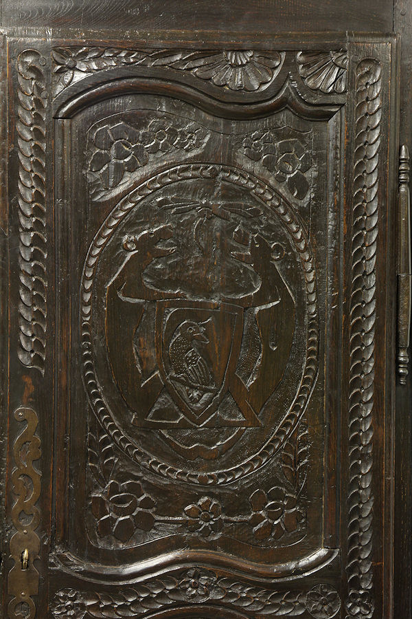 19th century oak bonnetiere from the Brittany region of France with bears carved on the door, circa 1870.