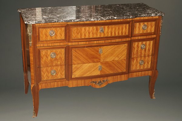 19th century French commode with marquetry inlay and bronze ormulu in transitional style, circa 1880.