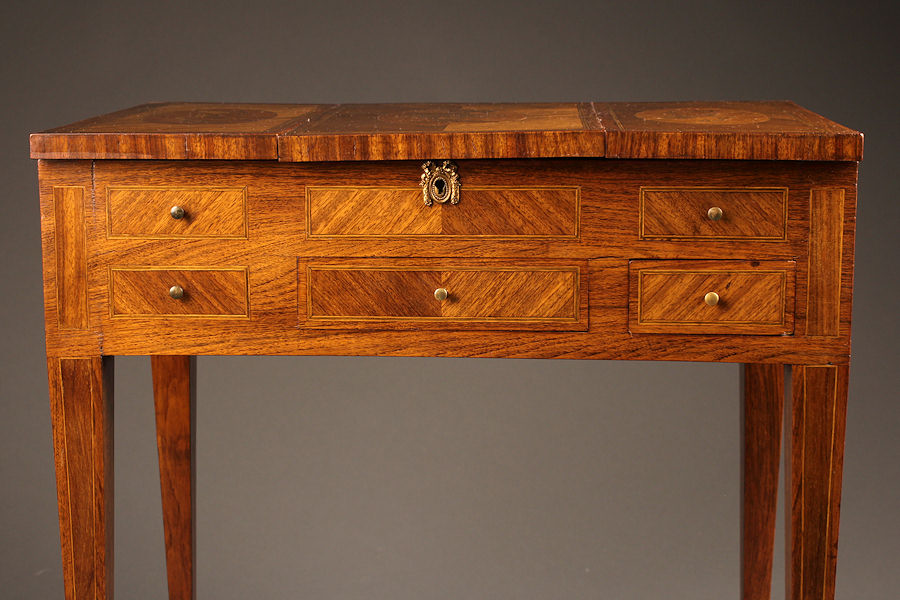 19th century French Louis XVI style vanity stand with mirror in inlaid mahogany, circa 1860-80.