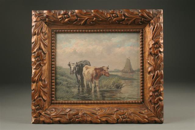 19th century french oil on board of cows by the water, circa 1870.