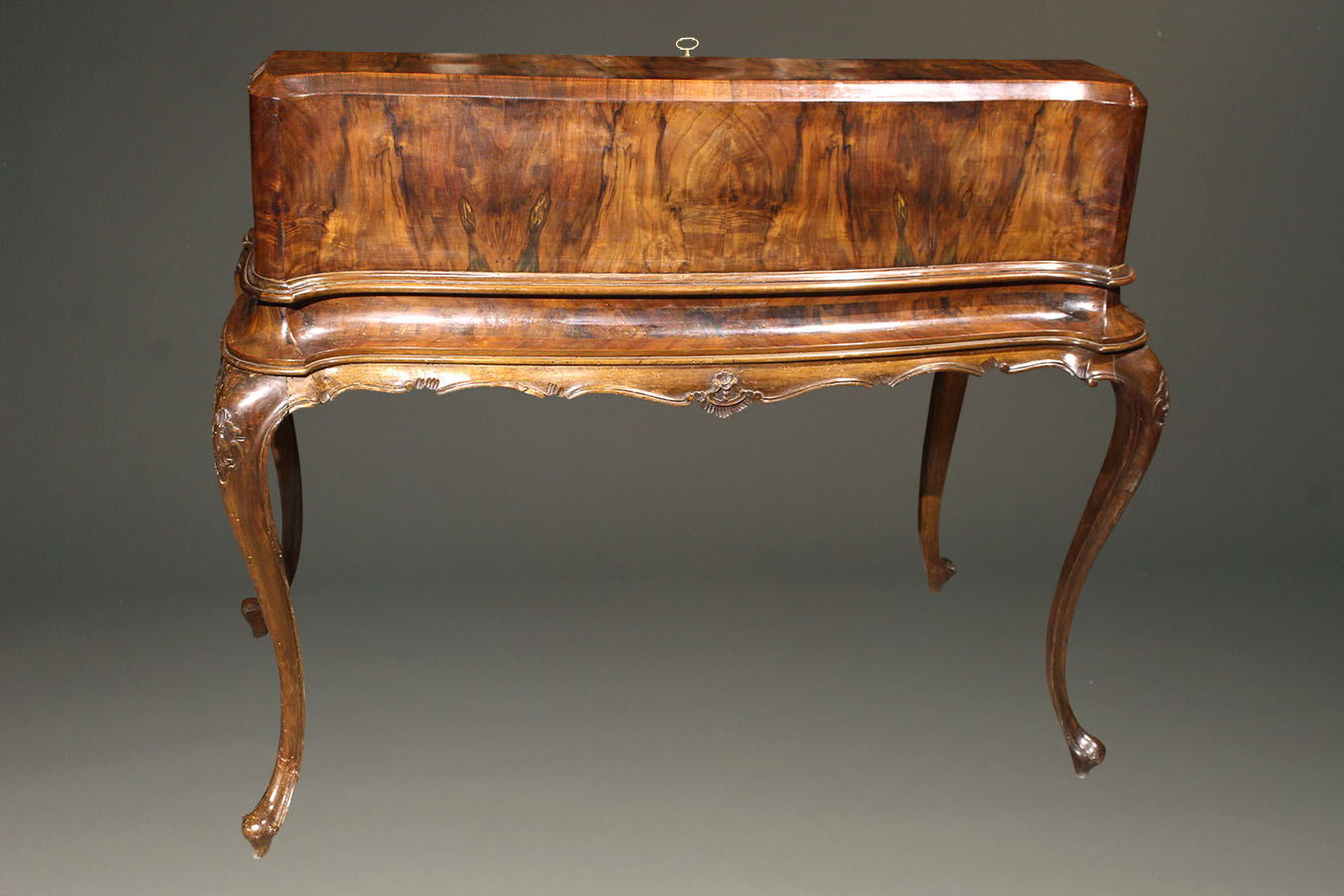 19th century Italian ladies writing desk with elegant lines made in burr walnut.