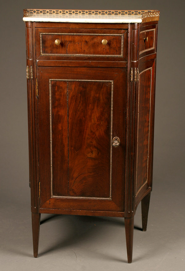 20th century French antique Neo-Classic style marble top nightstand with bronze gallery, circa 1920-30.