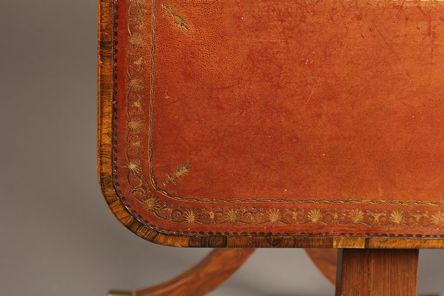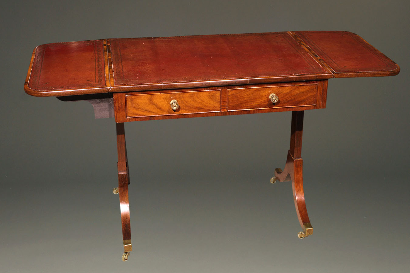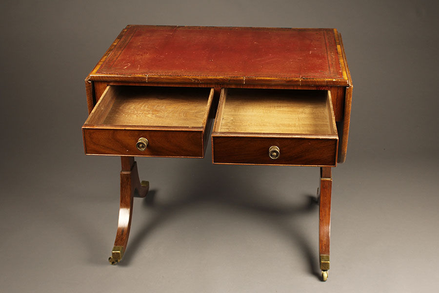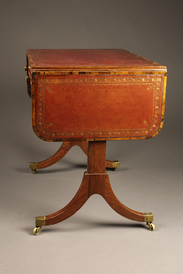 19th century antique English Regency period sofa table in rosewood with red leather top, circa 1820.