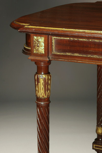 19th century antique French Louis XVI center table in mahogany with parcel gilt trim. Beautifully carved legs "H" stretcher base. Circa 1875