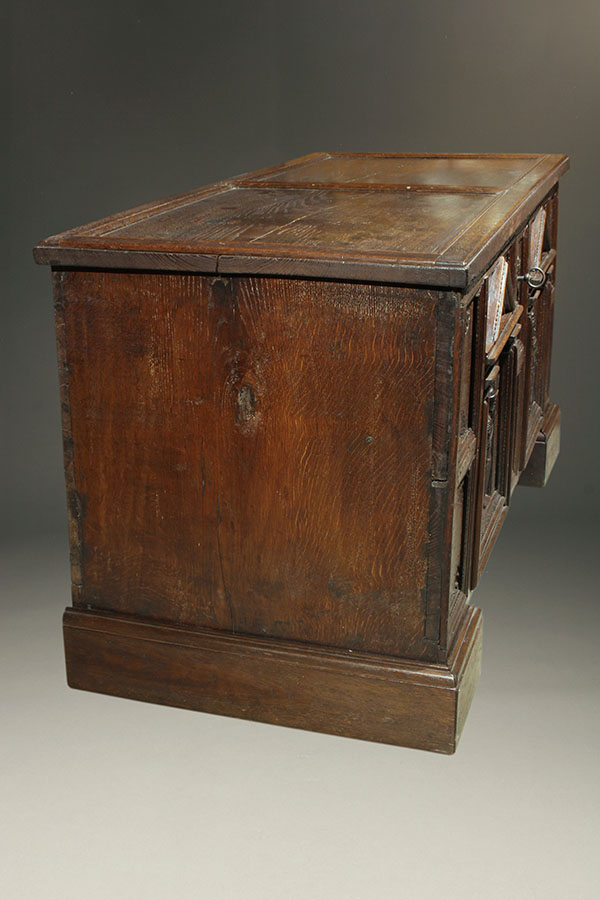 Medieval style Flemish lift top coffer in oak, circa 1700.
