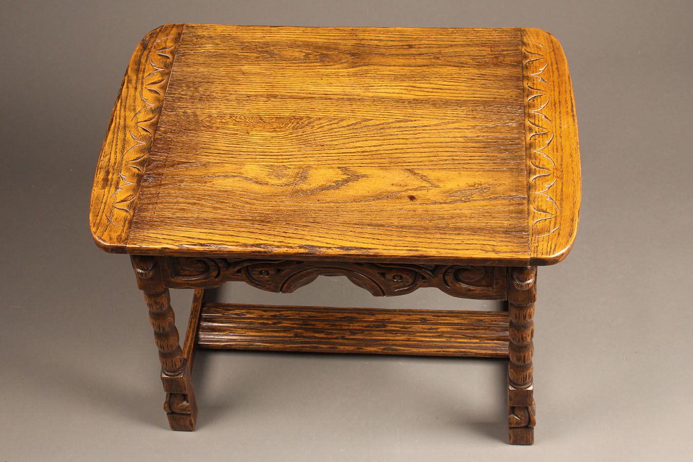 If you are looking for the perfect little table to flank the sofa in the den or to place in the sun room displaying your prized African Violet, this antique Belgian table should not be overlooked. The naive hand carved style of the apron and legs literally emanates a feeling of warmth and comfort. The top of the table, also in oak, has been tastefully accented with a simple carved design. If the beautiful 100 year old wood and design are not enough to charm the most discerning eye, this table also touts a spacious drawer.