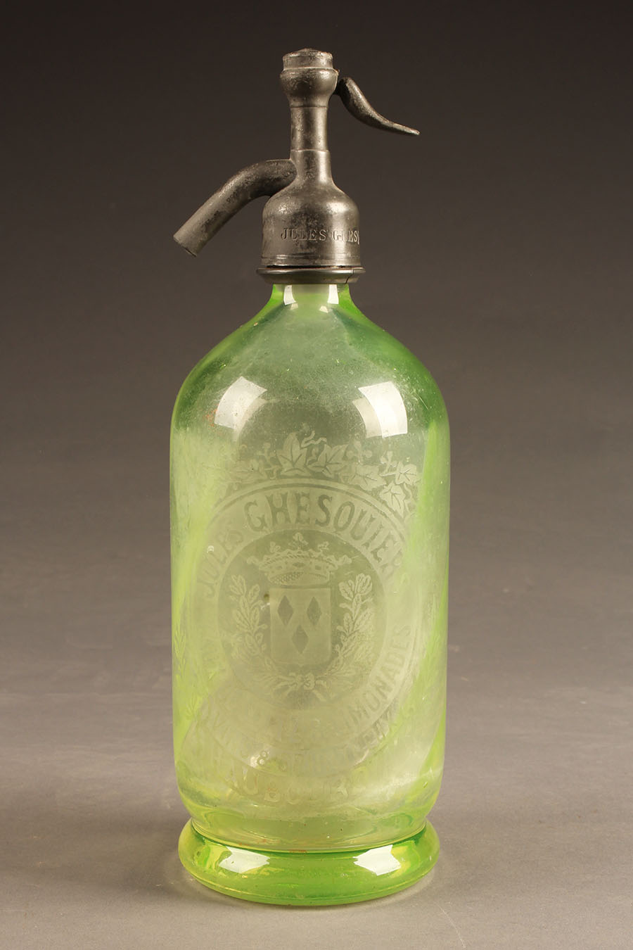Seltzer bottles were designed to allow the carbonated water to be dispensed without completely depleting the bottles pressure, preventing the remaining carbonate from going flat. Seltzer bottles were at their height of popularity during the 1920’s and 30’s.