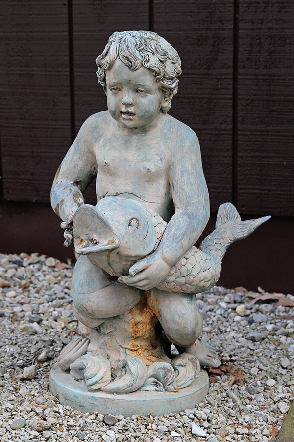 Bronze fountain of a boy holding a dolphin.