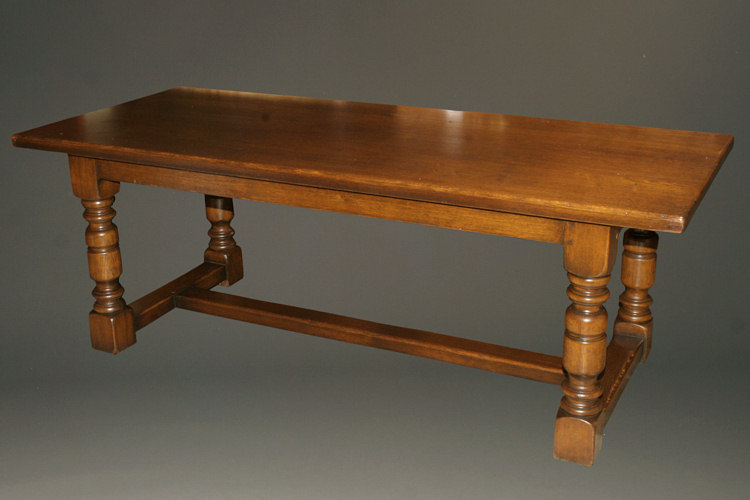 Custom English farmhouse table with turned legs and stretcher base made with pegged mortise and tenon joints in oak.