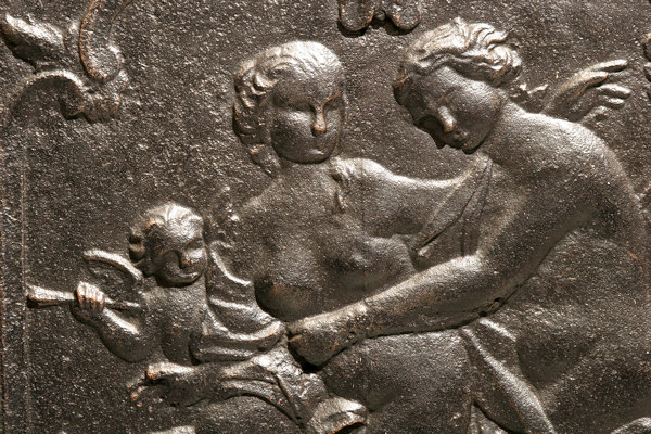 Early 18th century French cast iron fireback with lovers, cupid and lamb. Circa 1720