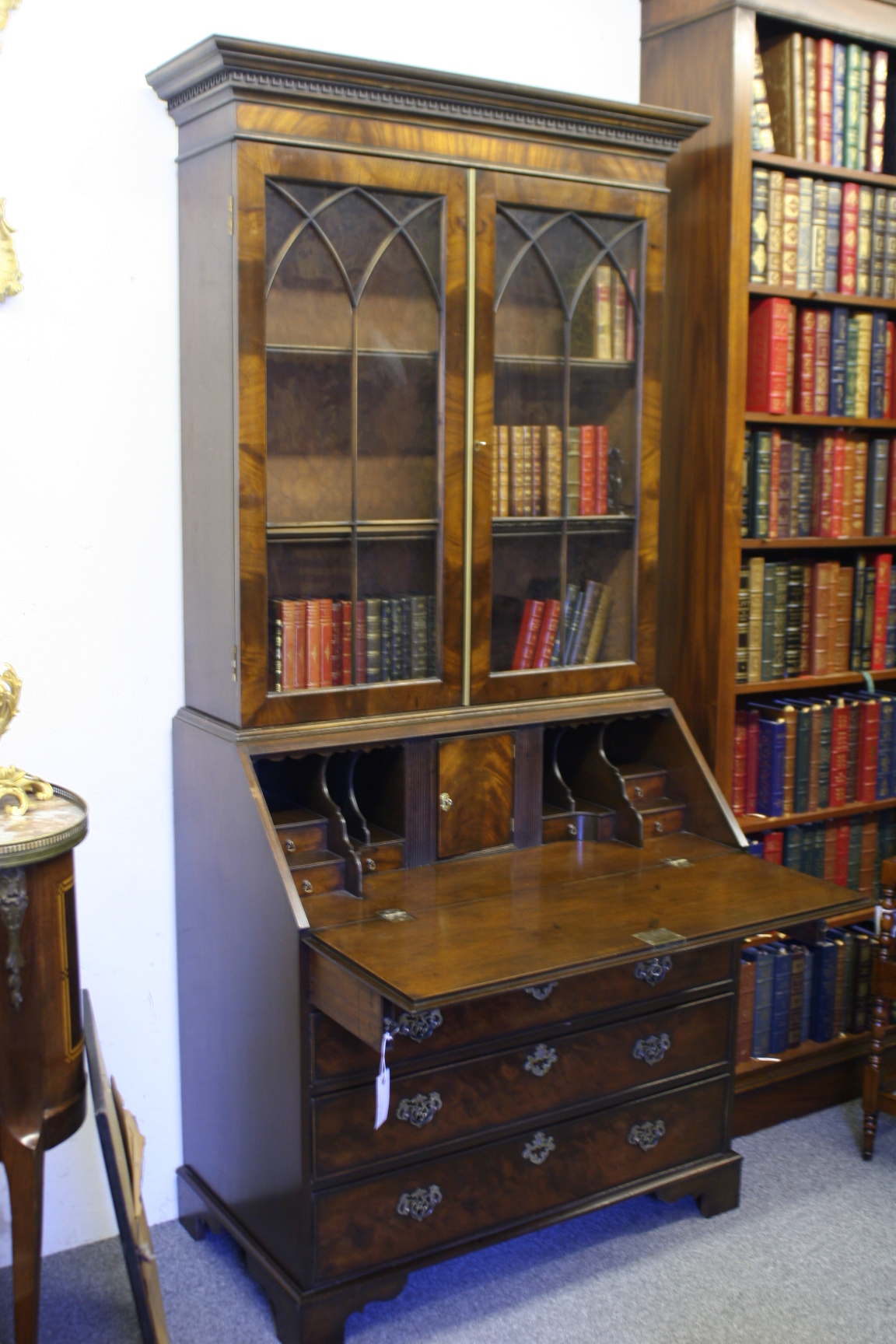 English 18th century style slant front desk with bookcase. Base with 18th century elements, newer top and interior. Made in mahogany with mullioned glass doors.