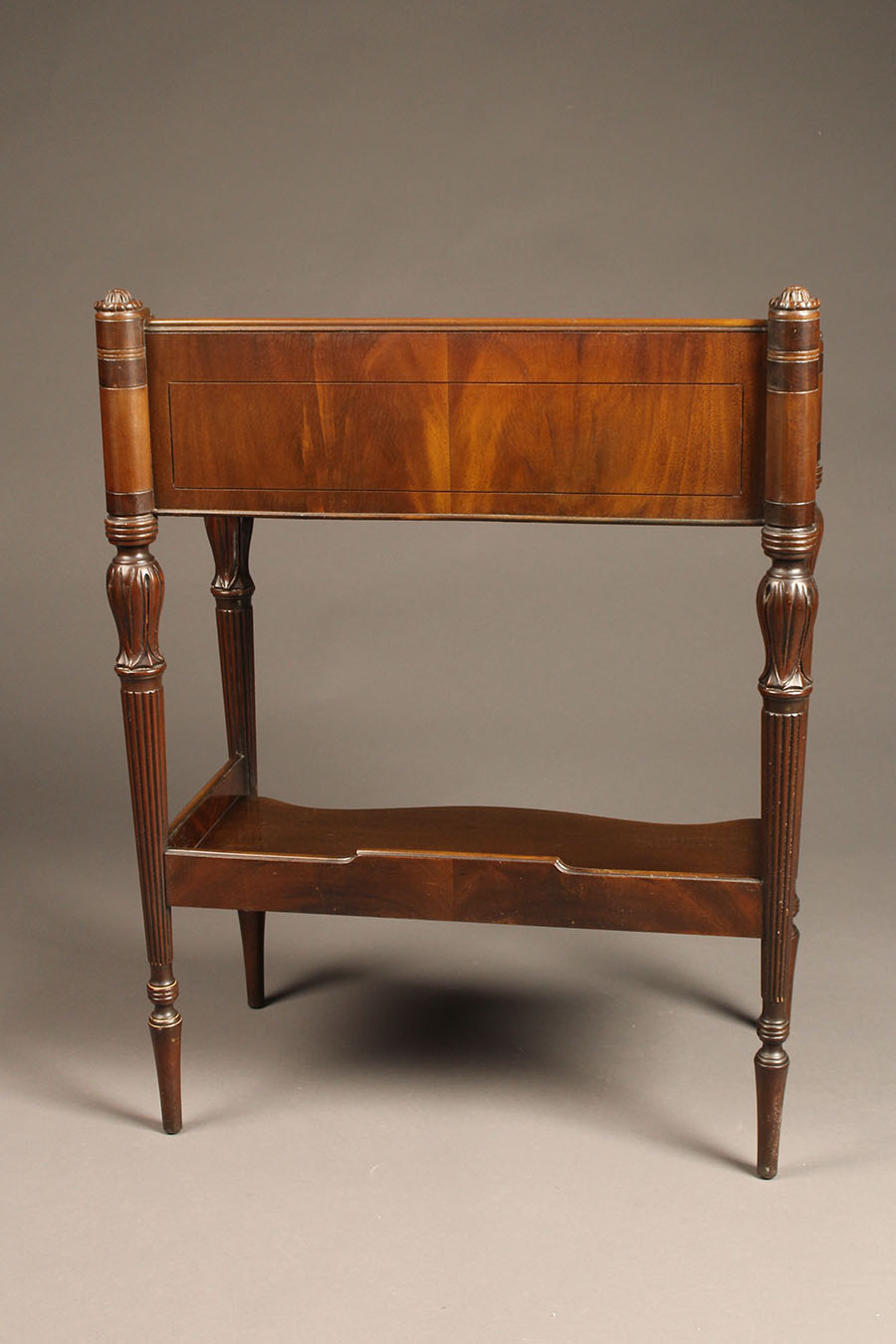 This is a very nice English book stand. It would be an excellent piece for any den or study. The top tray is ideal for holding books in an organized and safe manner. There is also a shelf which would serve as an excellent place to store papers or magazines. This book stand is made from mahogany and features 4 turned and carved legs plus a beautiful bookend matched grain front.
