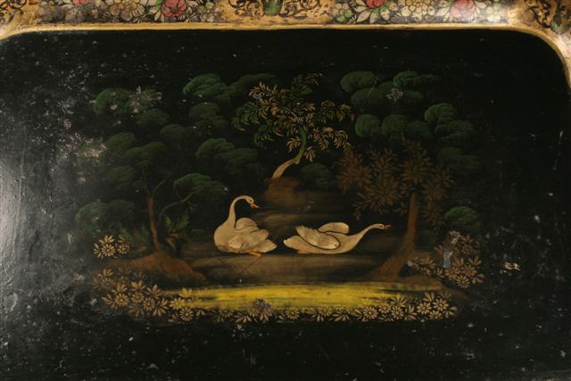 19th century French II Empire tea tray hand painted featuring geese on custom stand. Circa 1820