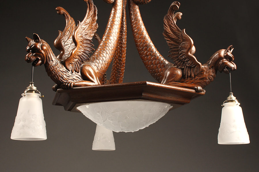 French antique chandelier with hand carved winged chymere figures with frosted Lalique style shades, circa 1920.