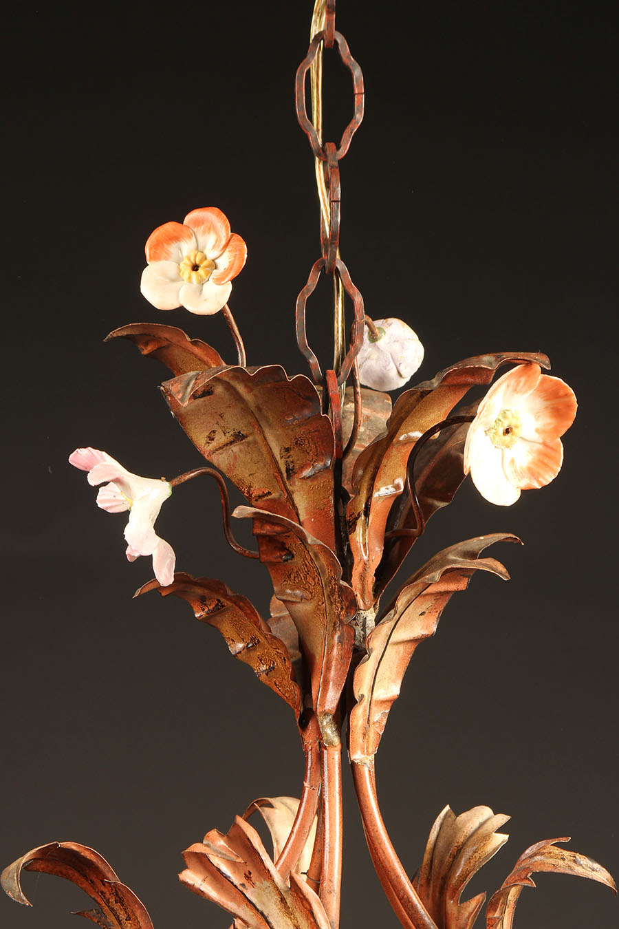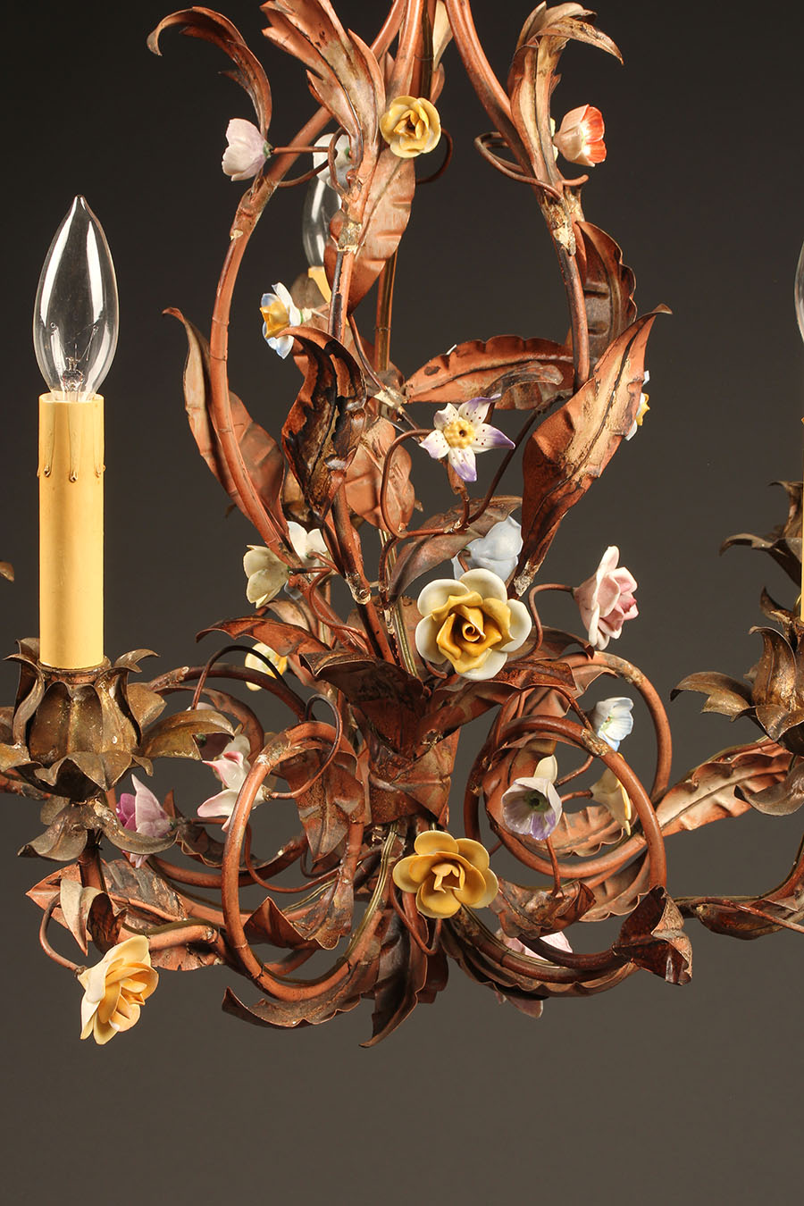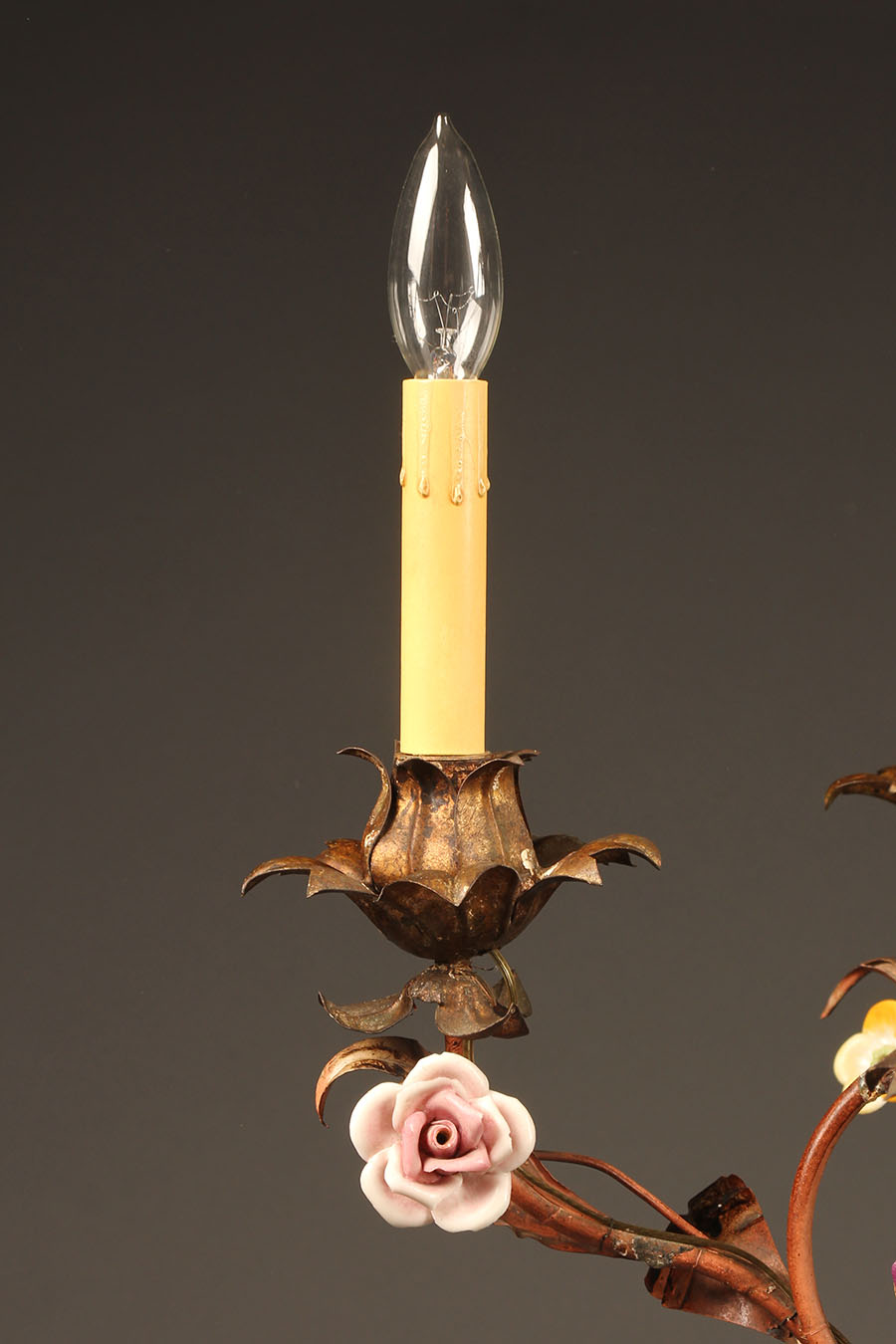 Antique Italian 5 arm iron chandelier with handmade porcelain flowers, circa 1920’s.