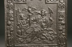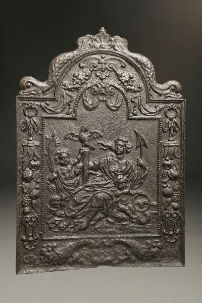 This French fireback is from the late 17th century and shows a woman and two pitch fork wielding cupids.
