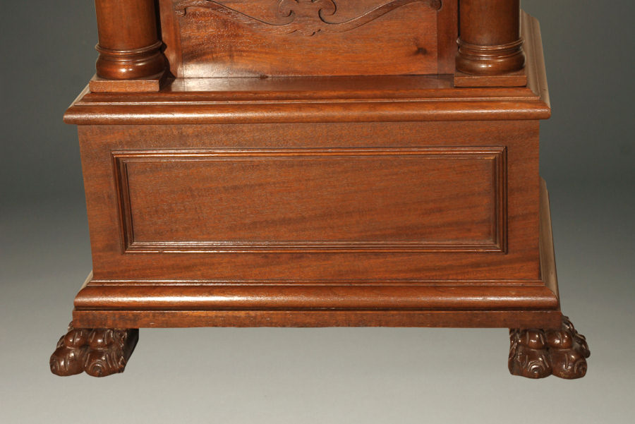 Late 19th century mahogany tall case clock with 8 day movement that plays the Westminster and Whittington melodys on 9 tubes, circa 1900.