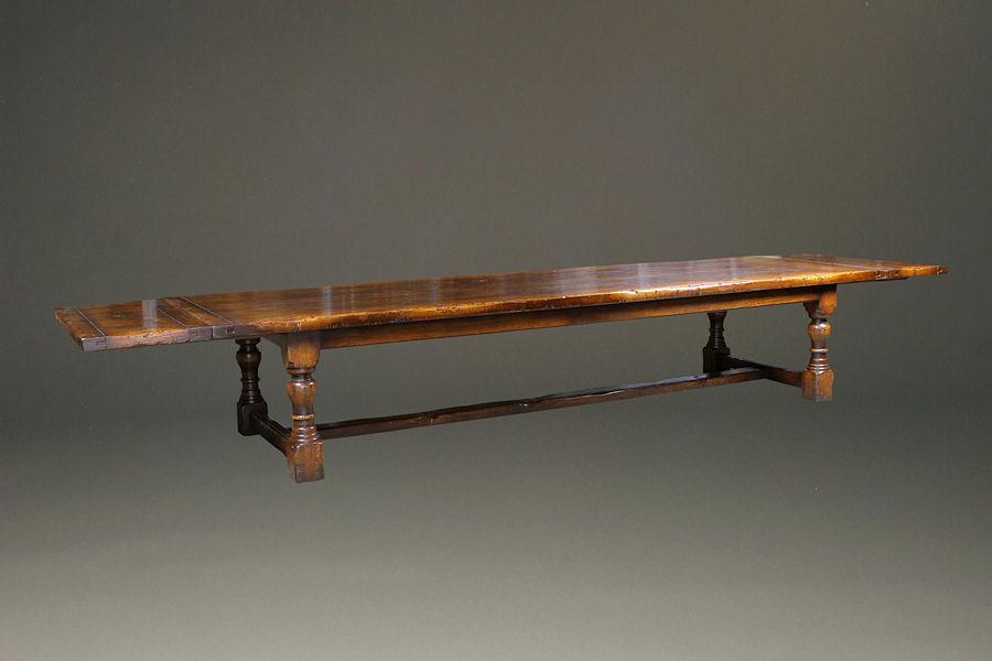 Massive custom oak refatory table with two leaves. The table is 150" long and expands to 190" when the two 20" leaves are used.