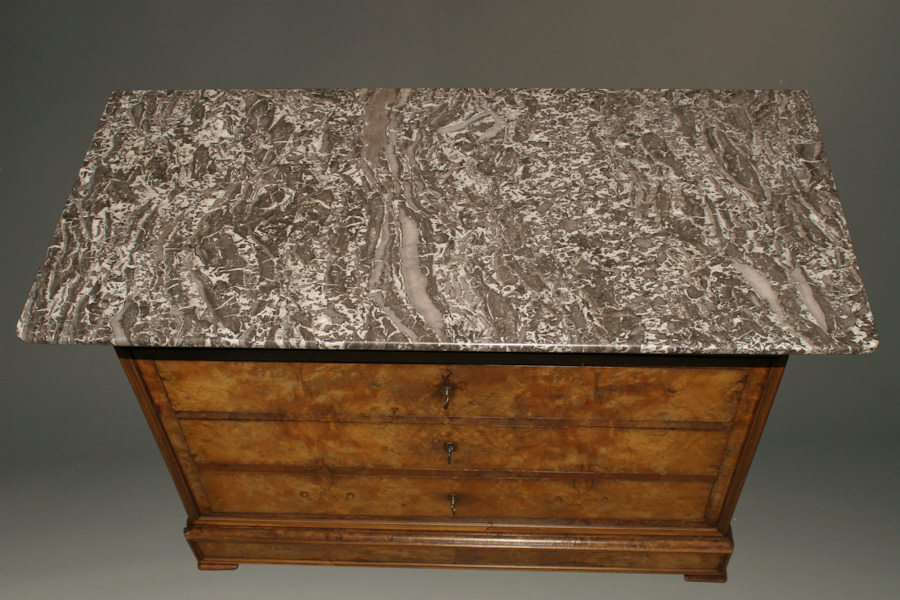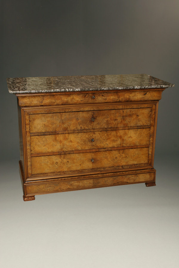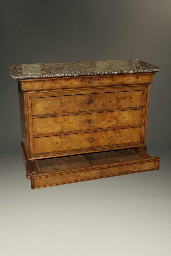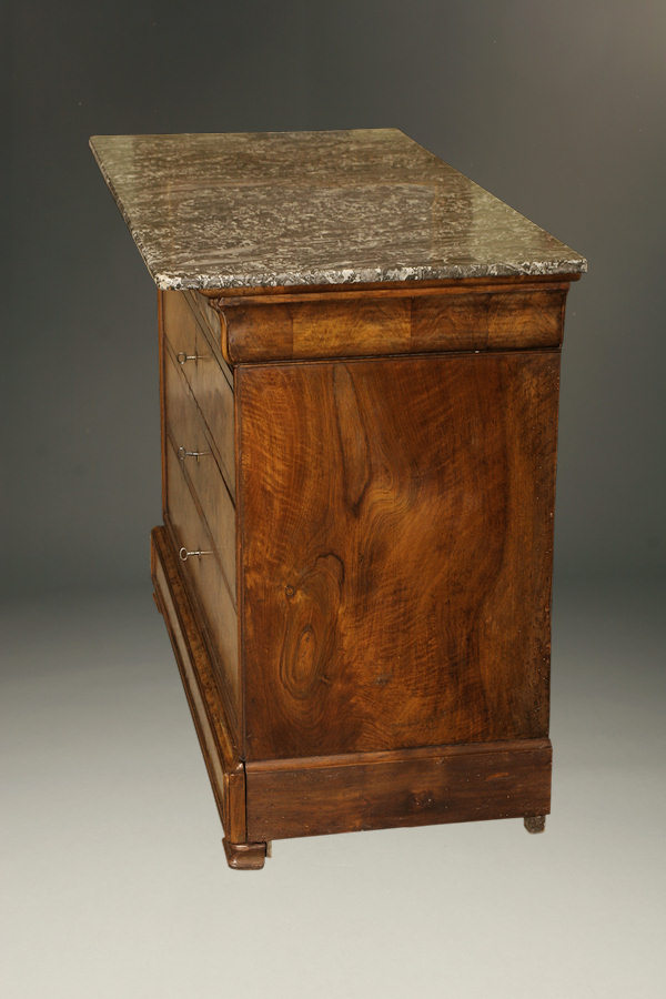 Typical of the Louis Philippe style, named after the conservative French monarch, this commode is clean lined, symmetrical, with no ornate decorations. It has a marble top and features a hidden drawer at the bottom.