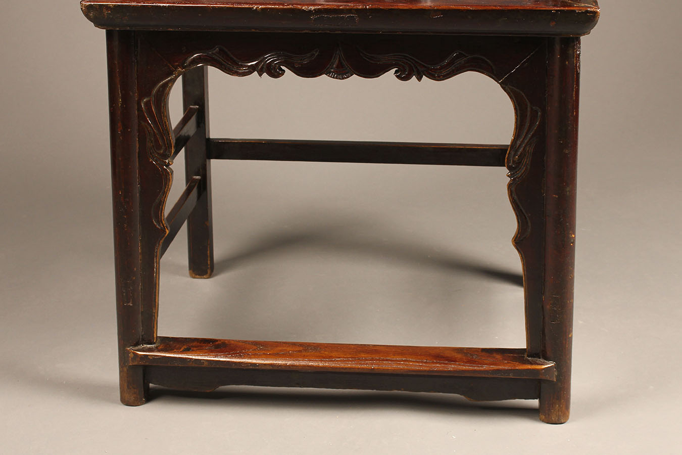 Are you looking for a pair of accent arm chairs with a less conventional appearance? This pair of antique Chinese chairs may be exactly what you are searching for. They would work wonderfully in an entryway, dining room or family room with a casual or formal setting. Constructed from teak using mortise and tenon joints these chairs are incredibly solid. The graceful curves of the arms along with the understated hand carved back splat will add charm to any room.