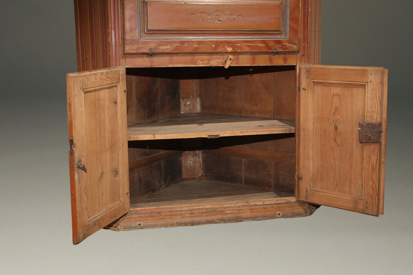 Early 19th century Norwegian pine corner cupboard with original painted finish dated 1825.