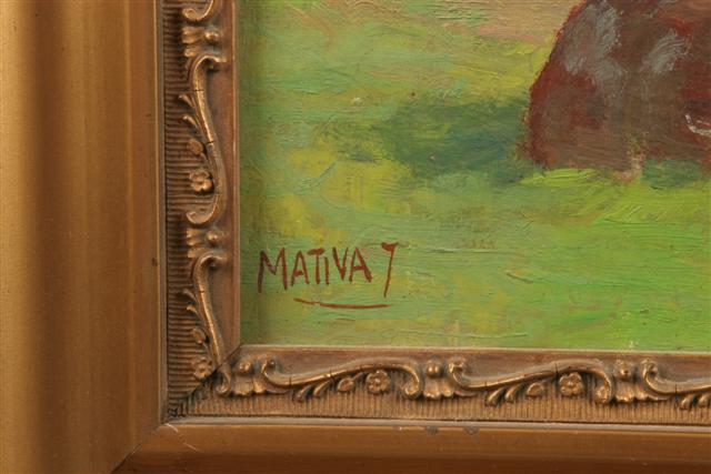 European oil painting of resting cow near 18th century farmstead. Signed Mativa circa 1920-30