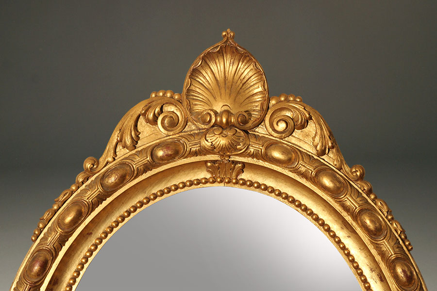 19th century Louis XV oval gilded French mirror with beveled glass.
