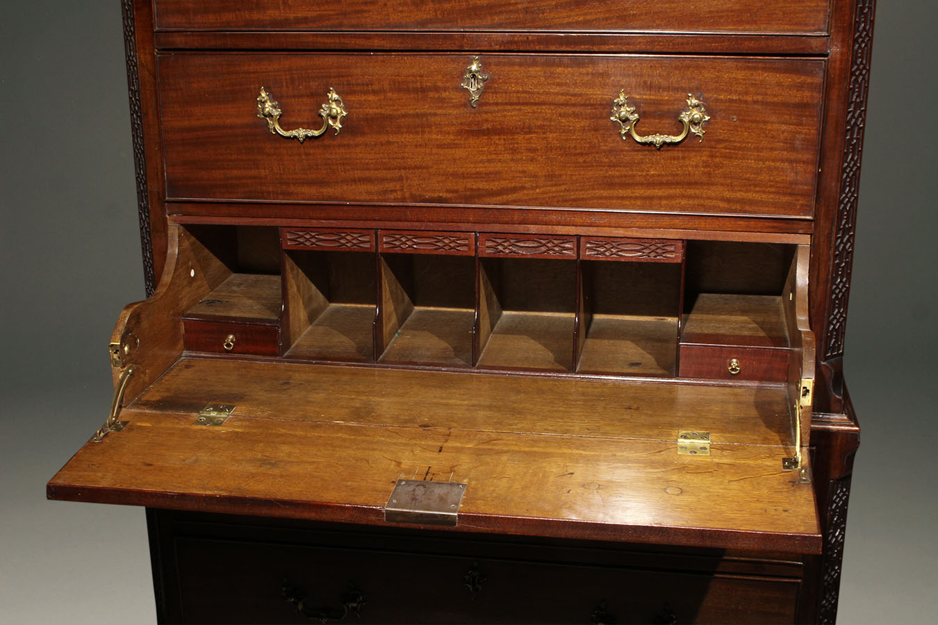 Period Chippendale style English mahogany chest on chest with writing drawer.