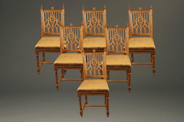 Set of 6 antique hand carved walnut French Gothic style side chairs, circa 1880.
