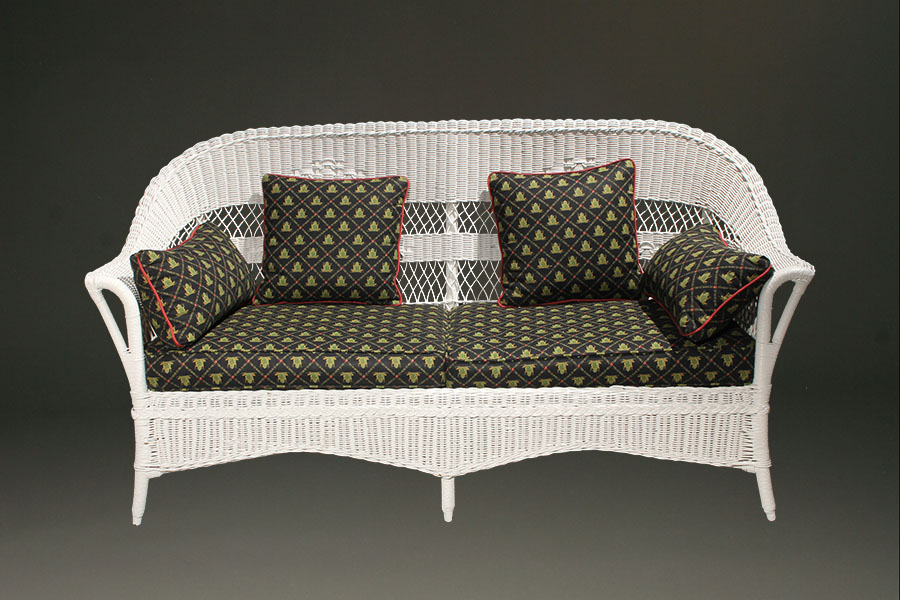 Petite vintage wicker sofa with nicely upholstered with frog pattern, circa 1920’s.