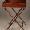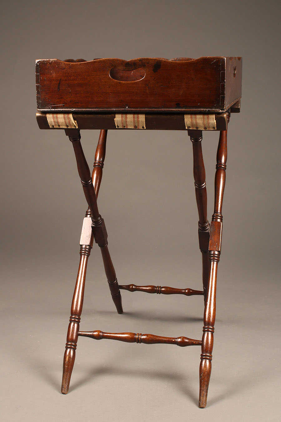 Very nice English butler’s table with dovetailed constructed tray with handles in mahogany and folding “X” base.