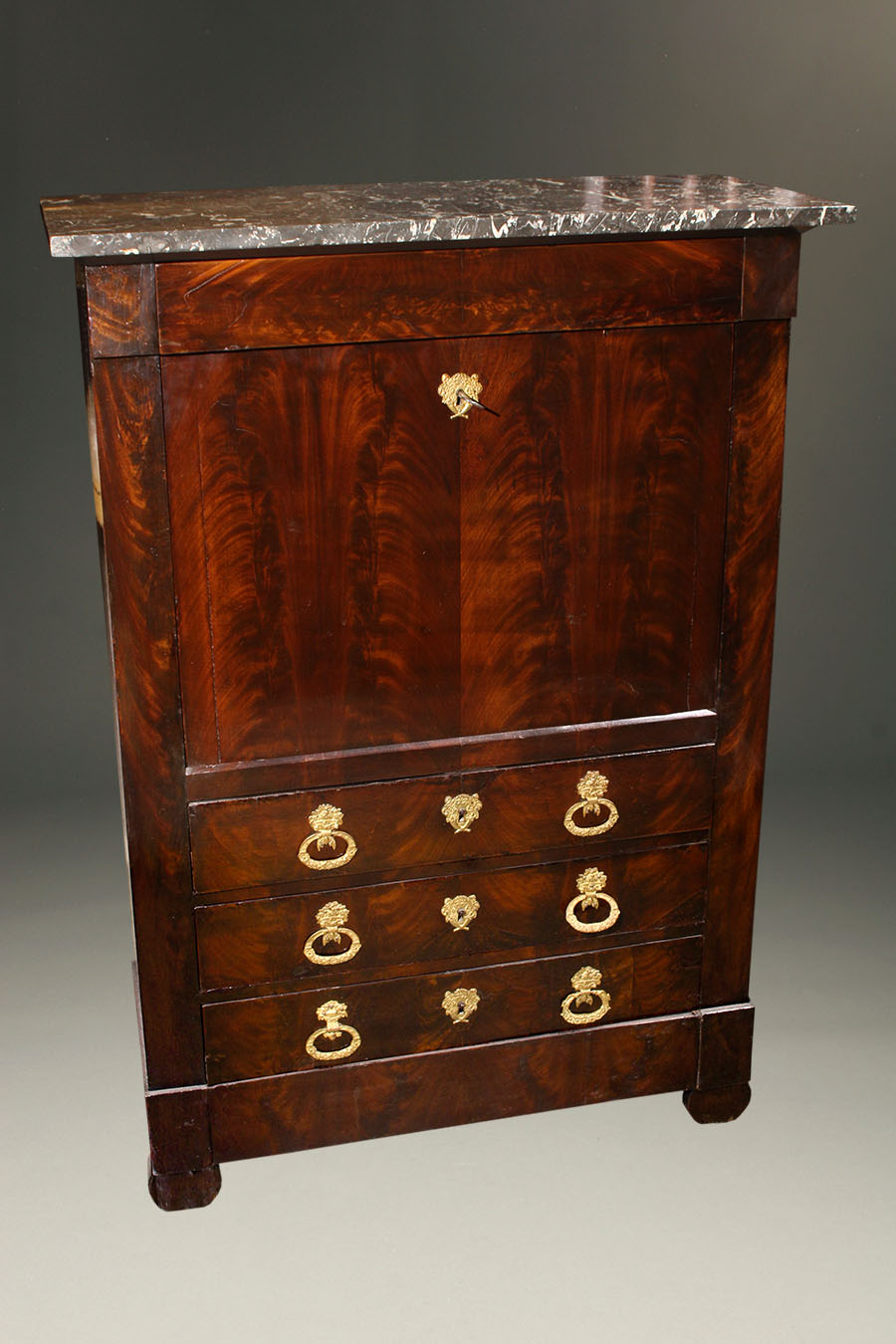 Mid 19th century French Empire style Escritoire in flame grain mahogany with bronze pulls and marble top.