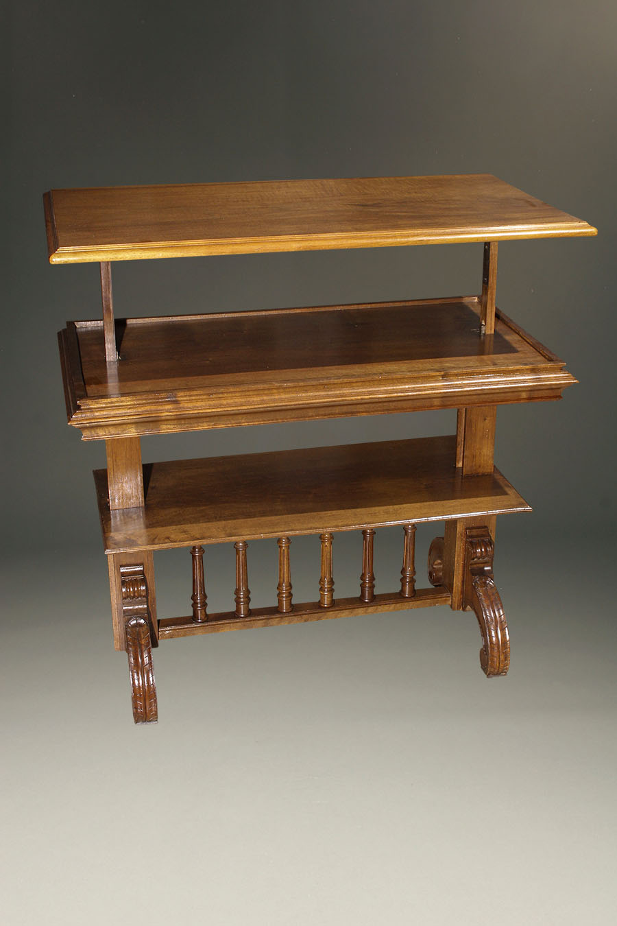 Very rare French walnut dessert table/server with collapsing shelves. When the server is “closed” it measures 29.5 ” tall, when “opened” it is 39.5″ tall.