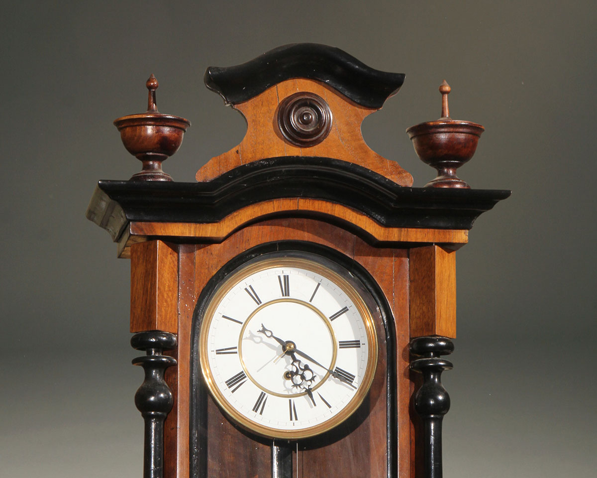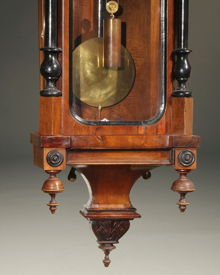 This is a wonderful antique Vienna regulator, circa 1890.  The clock’s case is of walnut with ebonized moldings and full columns.  The finely crafted Austrian movement runs for a eight days after a full winding and is driven by a single brass weight.  The delicate steel blued hands indicate the time on a enameled dial.