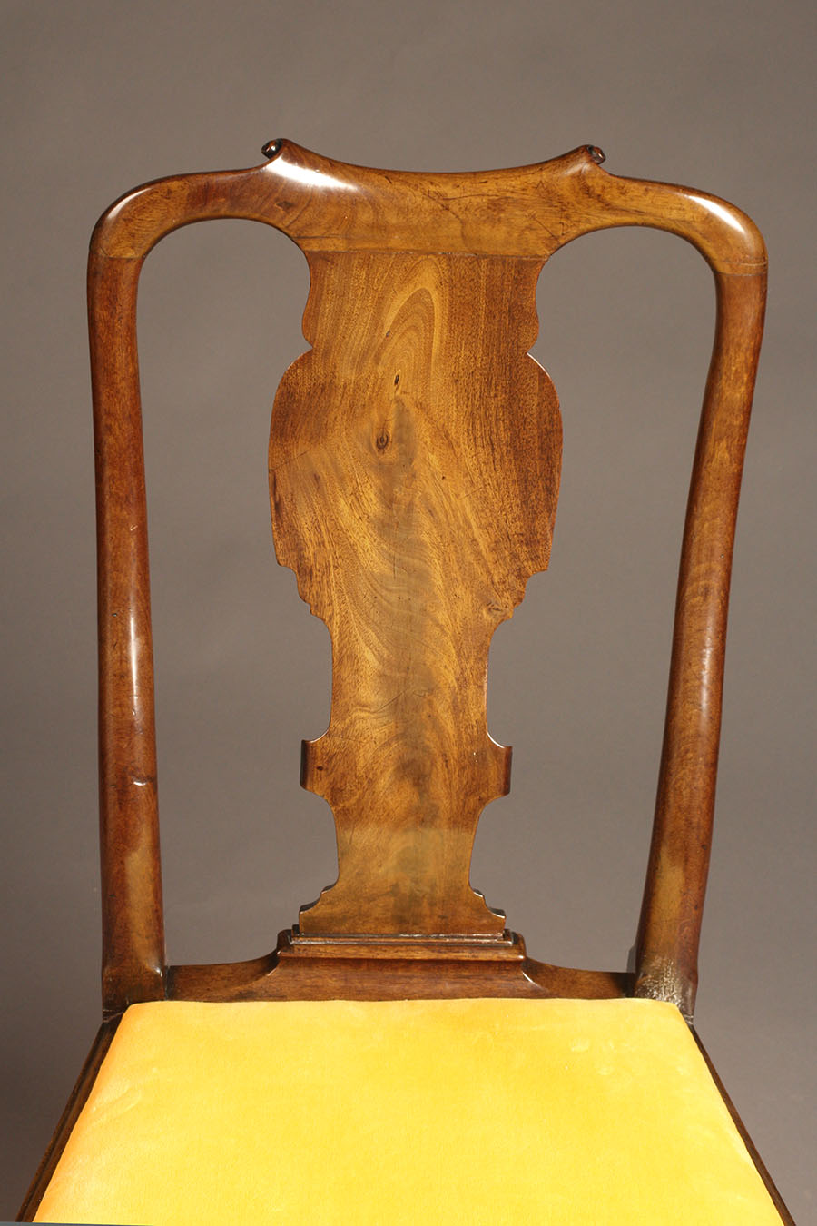 Very nice set of six late 19th century Queen Anne style side chairs with nicely detailed legs and beautifully figured wood grain on the back splats.