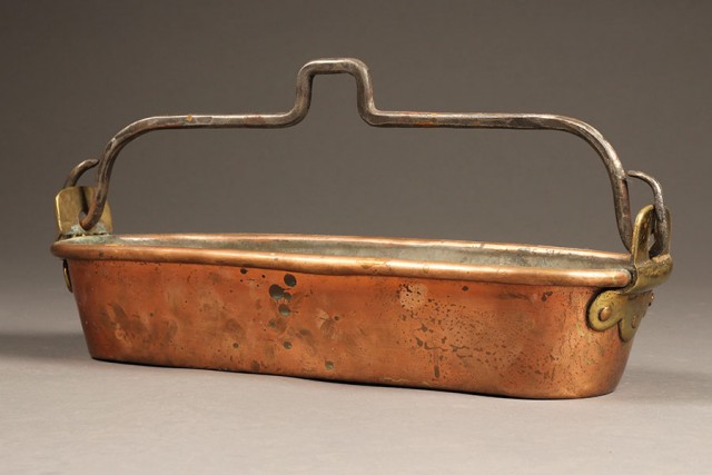The rich colors and unique shapes of antique copper pieces are a lovely way to bring warmth and visual interest to a kitchen or dining room. For example, the sumptuous lines and larger size of this 18th century Flemish teapot pictured above would be the perfect accessory for open shelving, buffet top or a deep window ledge. One of the best characteristics of copper is the patina that blooms from aging. This French poissoniere is a perfect example: